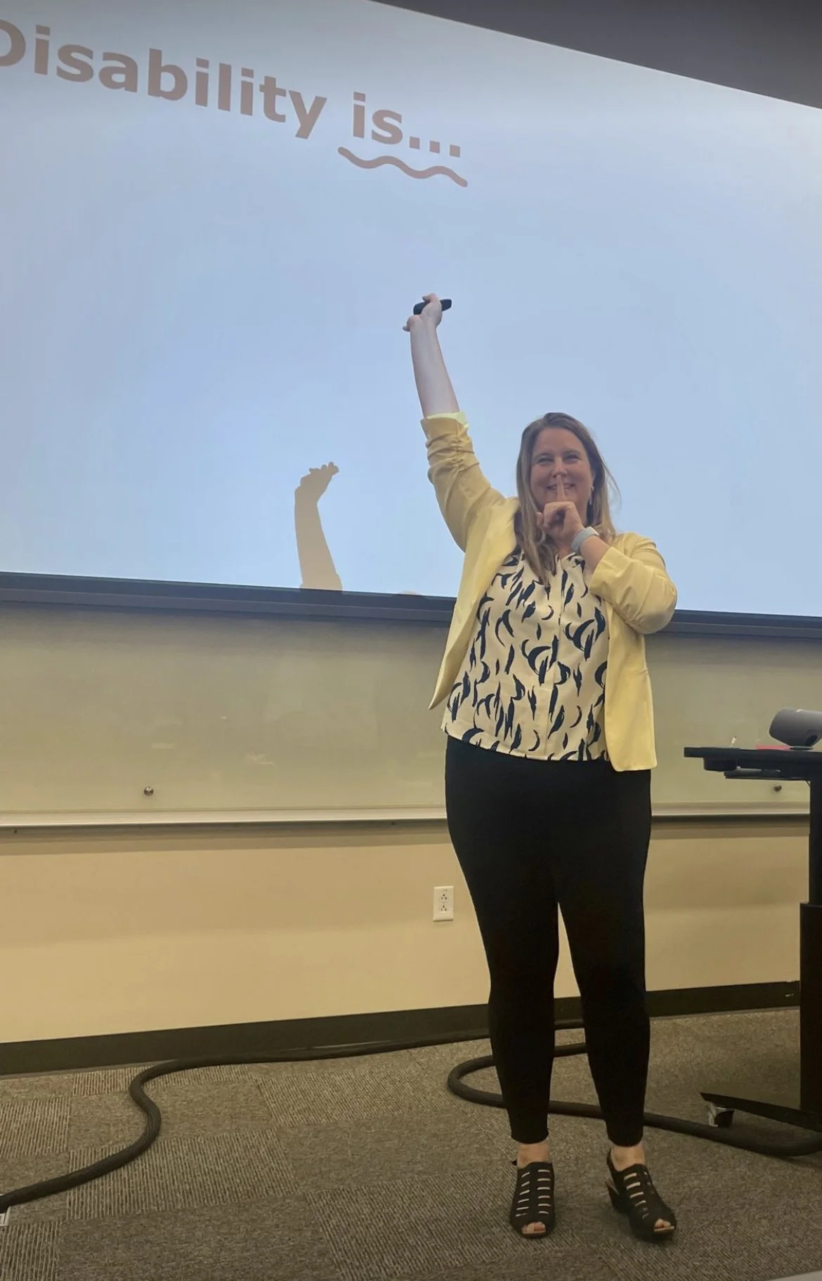 [Image description: A tall woman in a yellow blazer, light top, and black pants is in full profile in a classroom in front of a screen. The screen is blank with one phrase “Disability is…” in the top left corner. Her right hand is raised high in the air. Her left hand’s pointer finger is pressed to her lips. She is smiling. Photo by Amanda Katz.]