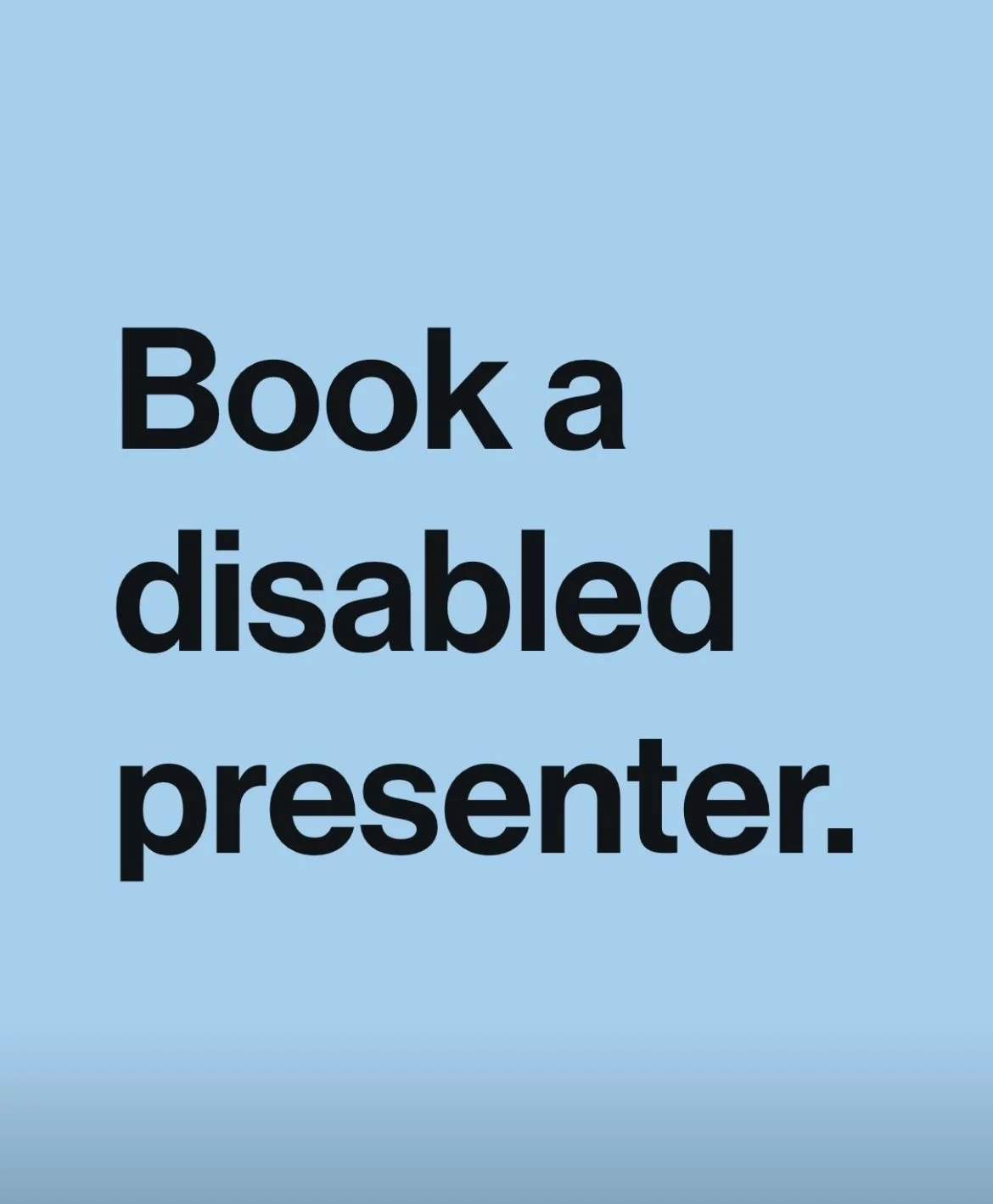 [Image description: The words “Book a disabled presenter.” in a black font on a light blue background.]