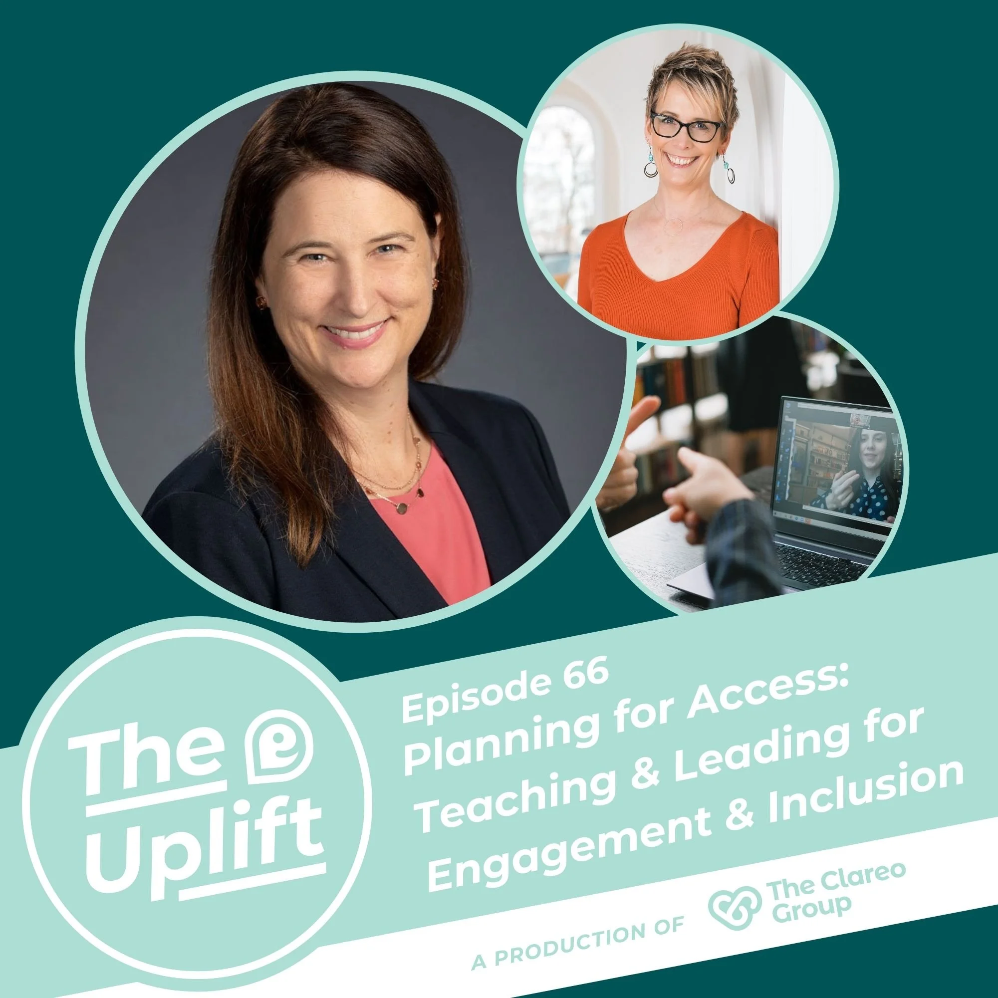 Image description: Square cover art for The Uplift episode 66. The bottom banner is the title “Planning for Access: Teaching and Leading for Engagement and Inclusion. A production of the Clareo Group.” The background is a dark teal with a light teal banner and white font. There are three images in bubbles in the top half. On the top left is a headshot of Stephanie Cawthon, with long dark hair, a blue suit, a coral shirt, and smiling into the camera. On the top right is a headshot of Carole Chaberies, wearing a bright orange shirt, long earrings, and a pixie haircut. To the bottom on the right side is a third bubble with a closeup of a video on a laptop with the person on the video and the laptop user both signing.